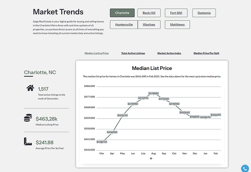 The Market Trends experience provides users with local real estate data and insights, reinforcing Saige’s authority while keeping users engaged with relevant, data-driven content. This adds an additional layer of value beyond listings and transactions.