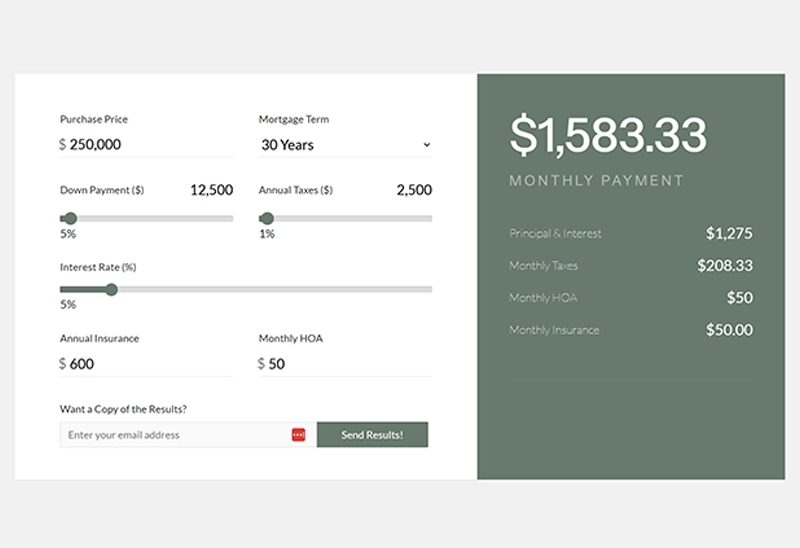 An interactive mortgage calculator that allows users to estimate monthly payments based on home price, interest rates, and down payment. This provides a clear breakdown of costs, helping users better understand their financial commitment before moving forward.